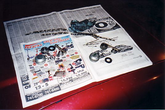 Scary. The left caliper is shot, no doubt. The rubber boot around the piston is actually no longer there, that I can find. Trying to push the piston in by hand results in absolutely no movement. The right caliper isn't much better -- the boot is there, but flakes off when you bump it. ![]() With the wheels off, I can get a good look at the bushings. On the left side, the outer tie rod end bushing is essentially gone, on the right side, it's in sorry shape. The inner tie rod bushings aren't much better. The ball joints are very sorry-looking, the dust cover for the strut is awful-looking, and the stabilizer bushings are trashed on both sides. An inspection aided by the parts catalog and the FSM leads me to decide that the following are bad: