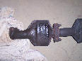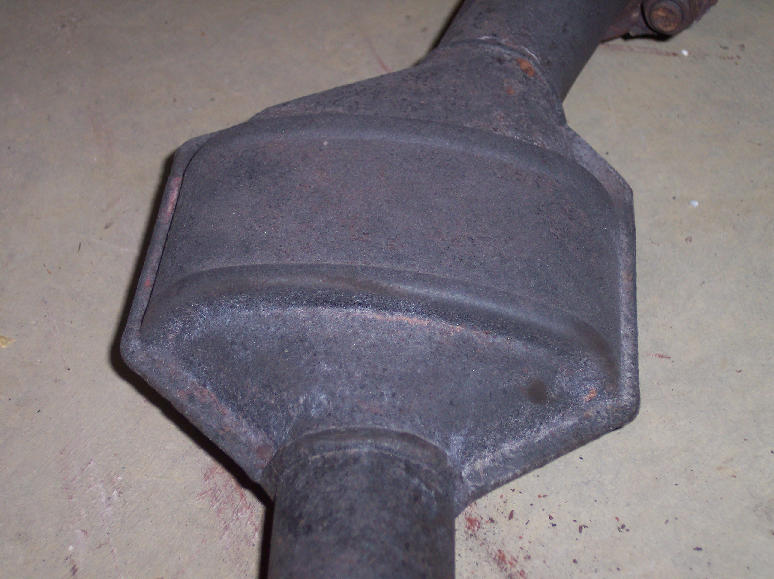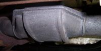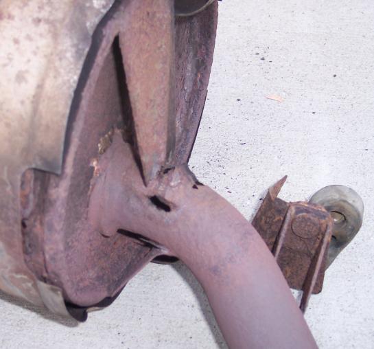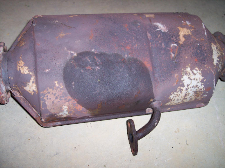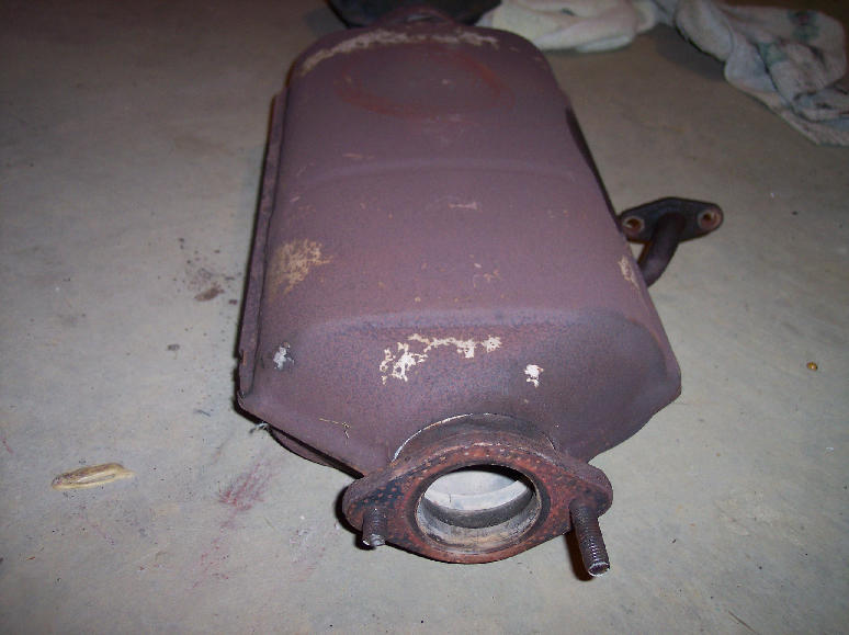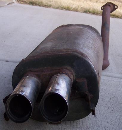 through. Will search for appropriate replacement. I bought a used exhaust system from someone who was parting out a wrecked '85 GSL-SE. The car had only 50 or 70 thousand, and the cats look to be in about the same shape as the ones on my car. The connecting pipe (between the cats and the muffler) is basically brand-new, so it, alone, was worth the price. Here's the muffler from that car: |
