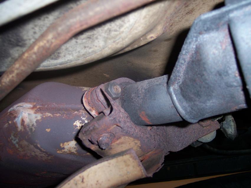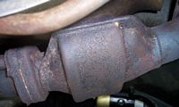 of the exhaust. The first cat looks like it's pretty solid: Looking at the second cat, it looks pretty good as well. I pulled off the lower heatshielding on both the first and second cats. It was disintegrating anyway, and I thought I'd get a better look. The cats all feel solid and don't seem to yield when being whacked with a screwdriver. The main cat has one tiny spot that might be a hole. I can't tell yet. The lower heatshielding is destroyed, but I have a replacement for that. Because the stud on the main cat is twisted off, I'm going to have to do something to get around it. I can try to drill it out, but I'm not sure how easy that will be. Since the cats that I got from the other car are in the same shape as the ones on the car right now (but with fewer miles, in theory), I'm thinking that I might be better off pulling the three cats off the car and putting the lower-miliage ones on the car. That would, of course, solve my stud problem. I managed to loose one of the bolts holding the first cat to the header, but the other is being a bit stubborn. After crushing my fingers when the breaker bar slipped, I gave up for the night. |