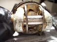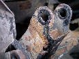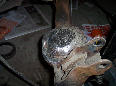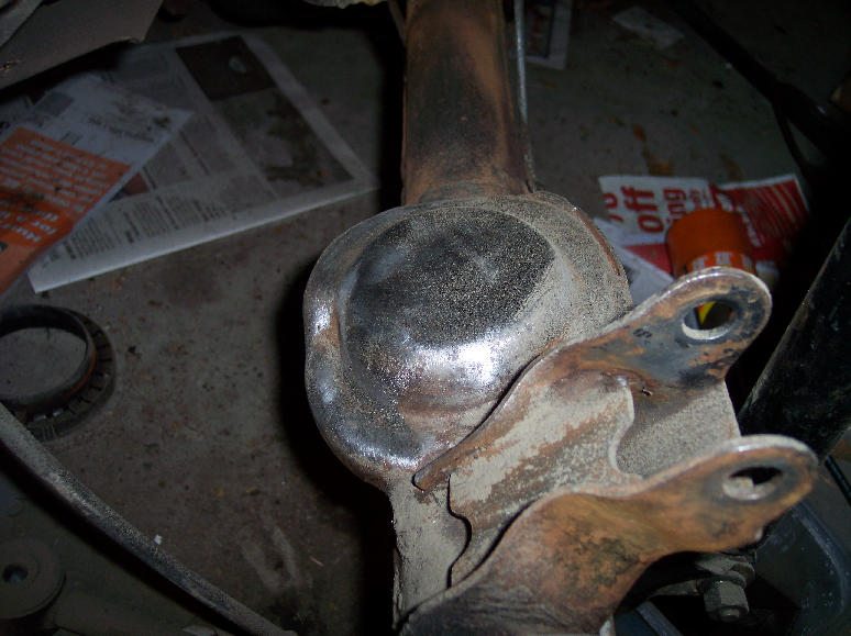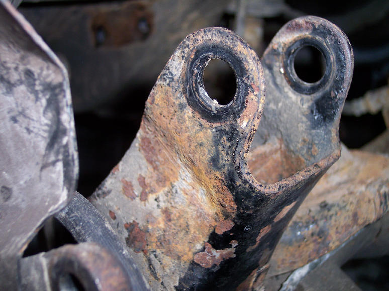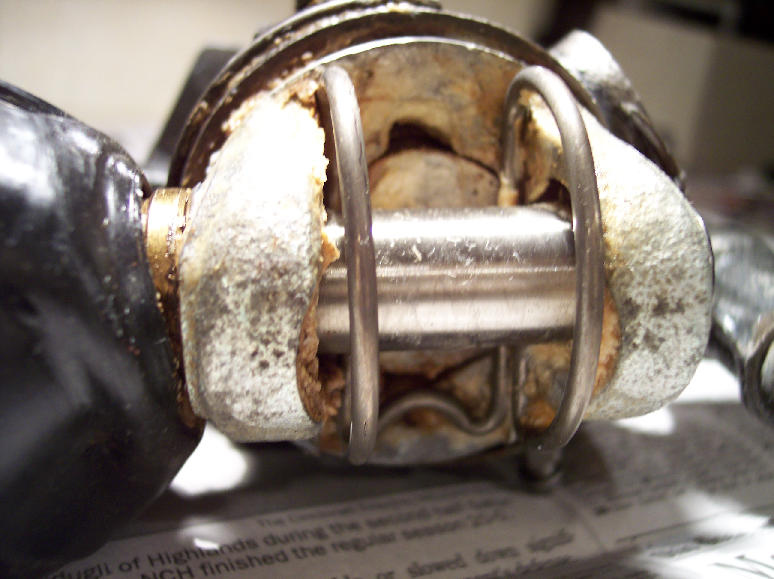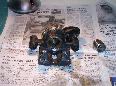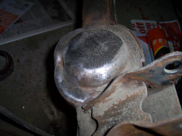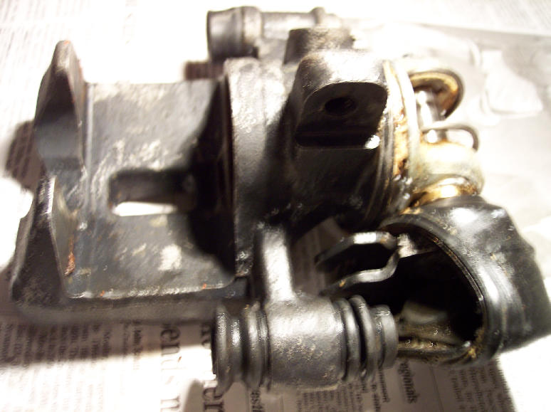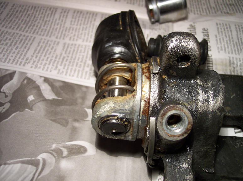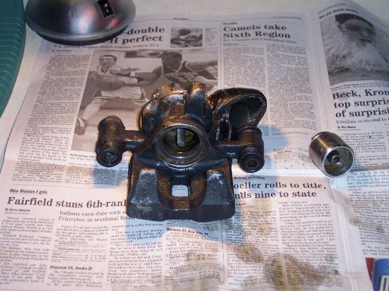 primer and paint. Started taking the calipers apart. Got the pistons out and found a muddly-looking mess inside. Not sure how to proceed from here... The bushings for the watts link arrived today. I thought I would have to have the shop at KOI install these, but I was able to press them in, by hand, with no problems. They're a two-part bushing, so it was pretty easy. I primered and painted the one watts link arm that I didn't have a chance to get to the other day. Looks sharp. |